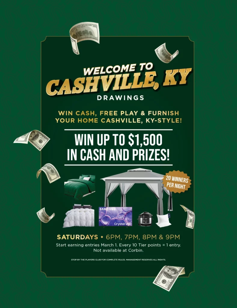 Come experience Cashville, Kentucky at The Mint! Every week, we’ll be setting the stage for a fun, energetic atmosphere centered on the excitement of winning big!